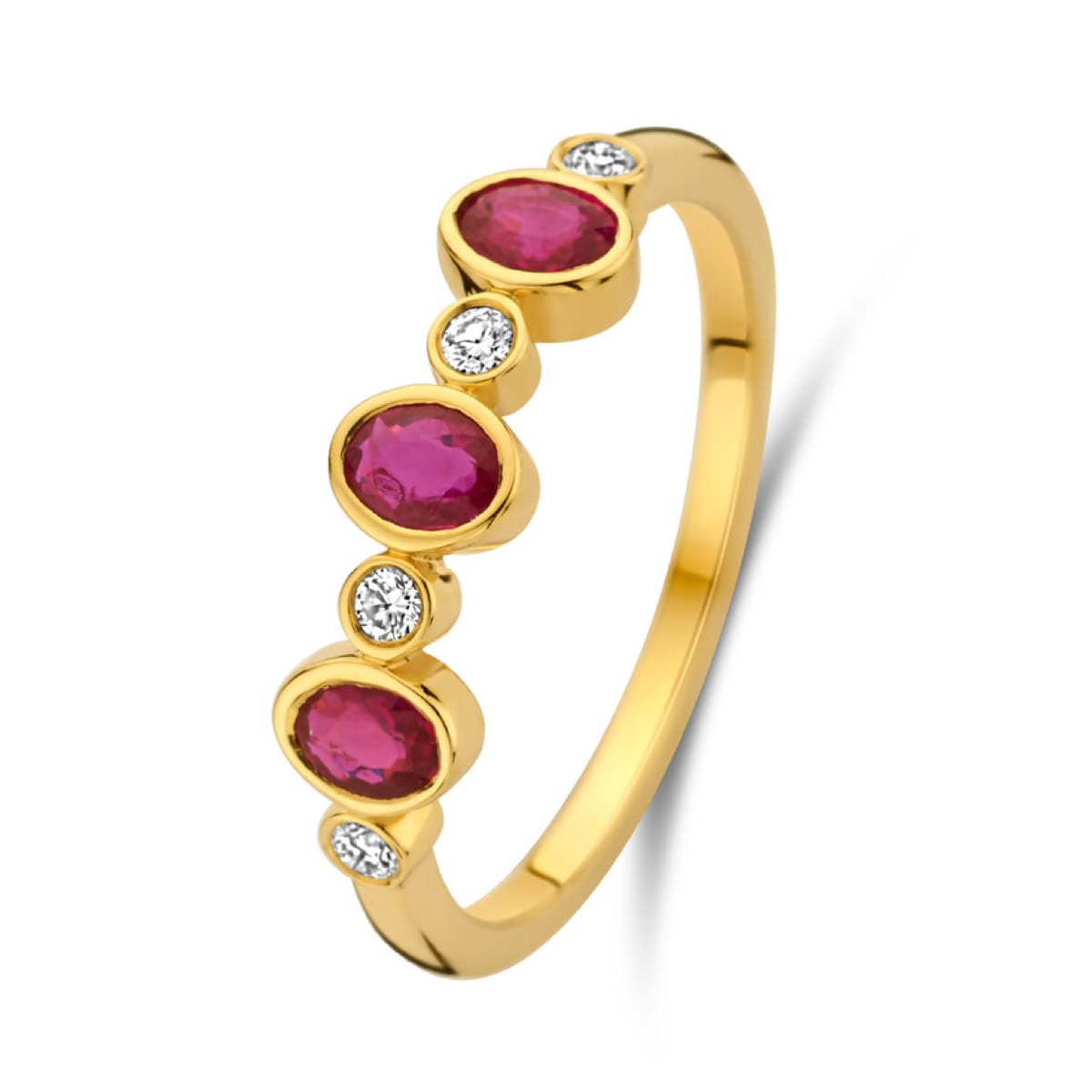 Alliance or jaune, alternant diamant taille brillant serti clos et rubis ovale serti clos