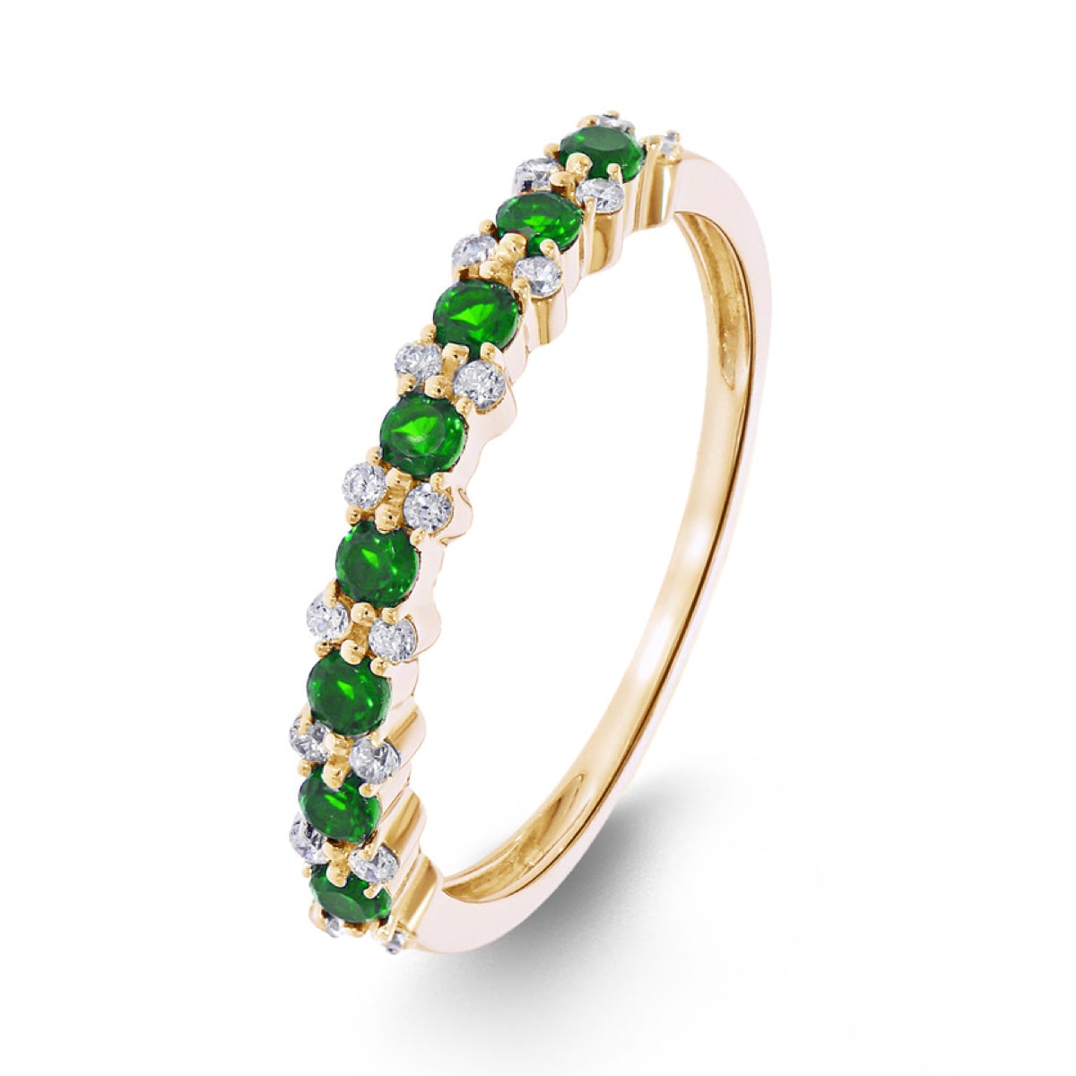 Alliance en or jaune, alternant 2 diamants taille brillant et une émeraude.