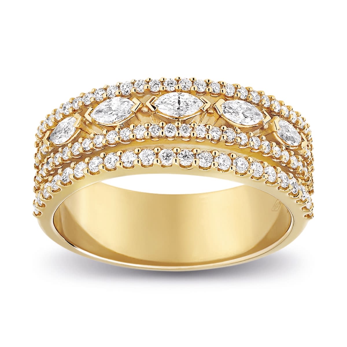 Une large bague bandeau en or jaune entièrement sertie de diamants taille brillant et taille navette.