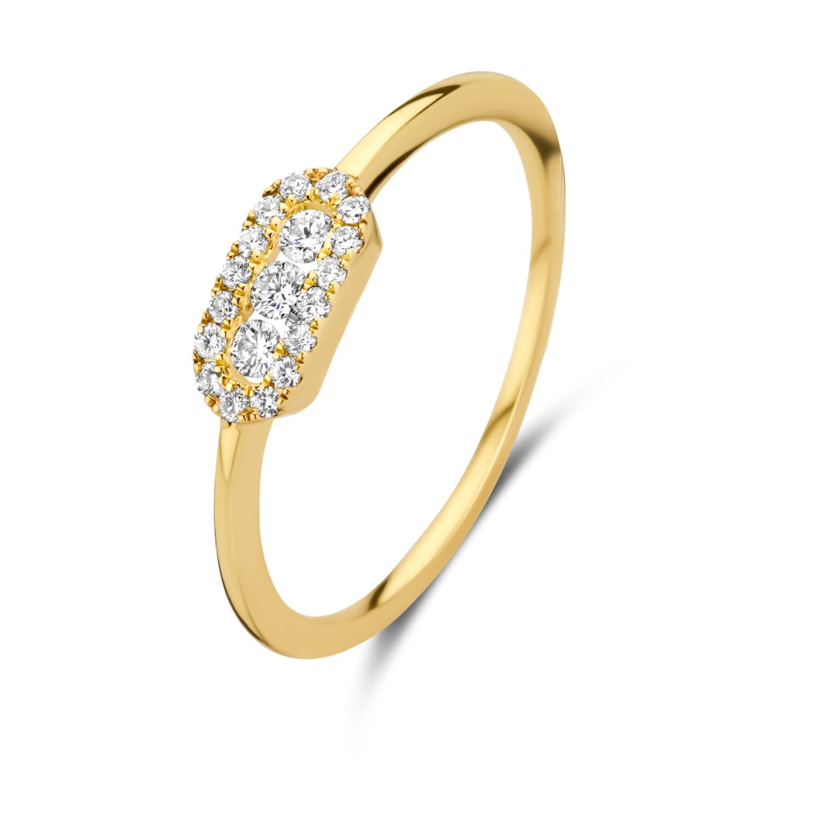 Bague trilogie diamants taille brillant avec un entourage diamants en serti grain.