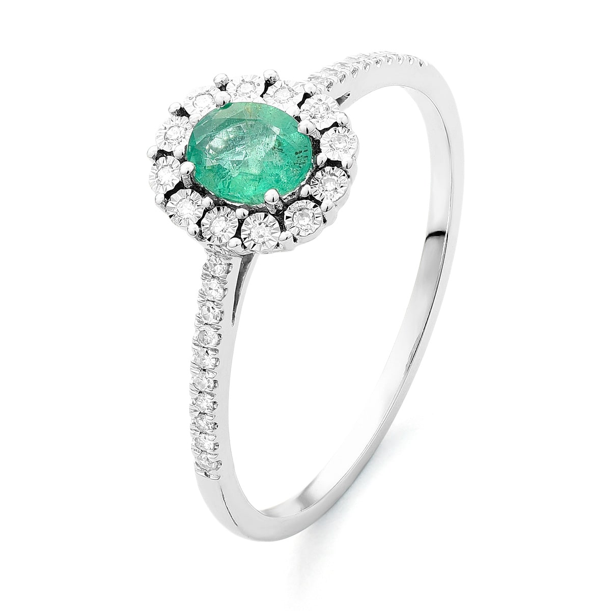 Bague émeraude taille ovale entourage diamants sur or blanc