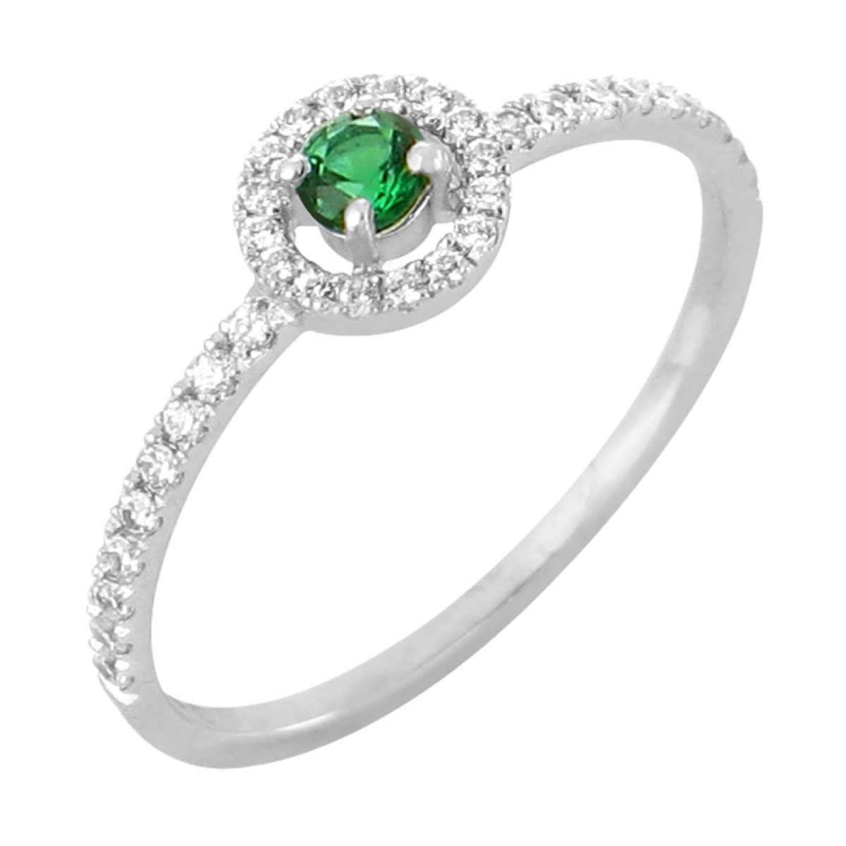 Bague or blanc, émeraude ronde serti 4 griffes et son entourage diamants et son habillage diamants