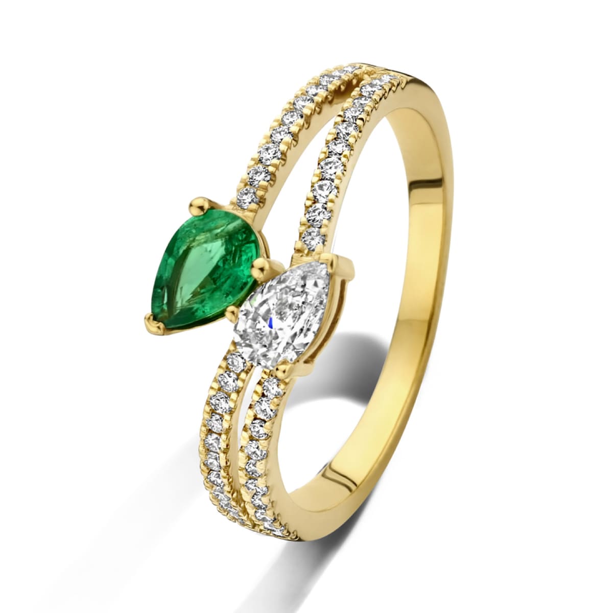 Bague or jaune toi et moi émeraude et diamant taille poire, serti 3 griffes, double descentes de diamants.