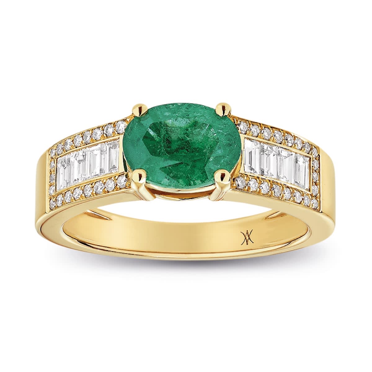 Bague émeraude de forme ovale et diamants baguettes sur or jaune