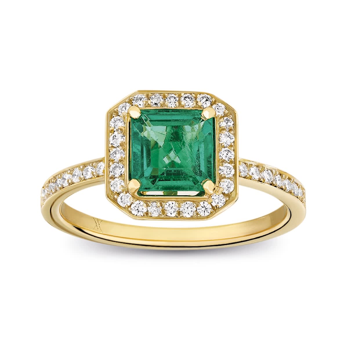 Bague en or jaune ornée d'une émeraude et entourée de diamants
