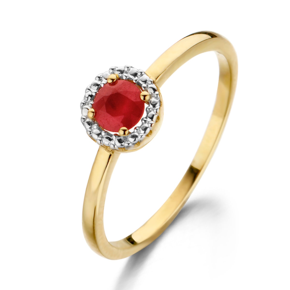 Bague or jaune, Rubis ronde en serti 4 griffes, entourage or gris diamanté
