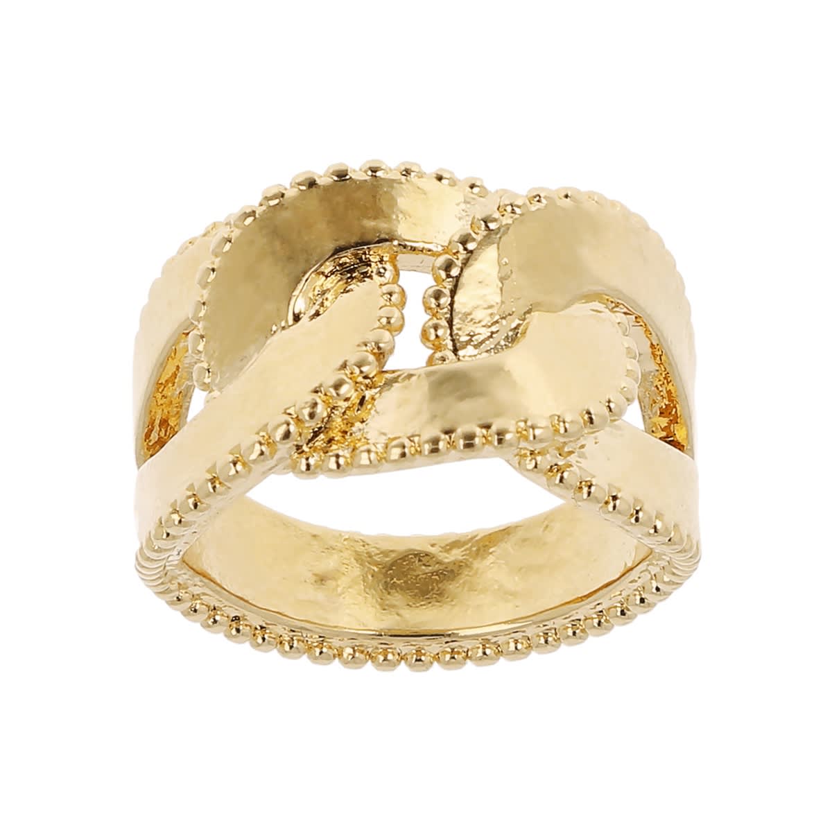 La bague gourmette en plaqué or jaune 18 carats d’Etrusca Gioielli est un bijou graphique et intemporel.