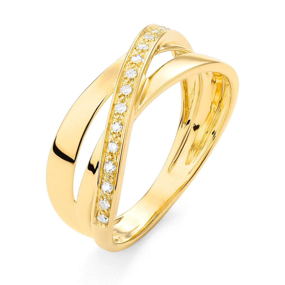 Bague en or jaune avec 2 liens uni poli entrelacés avec un lien pavé diamants serti grain
