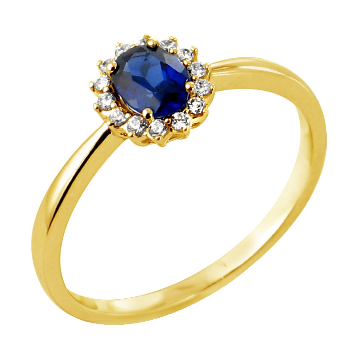 Bague or jaune, Saphir de Ceylan ovale, serti 4 griffes avec entourage diamants