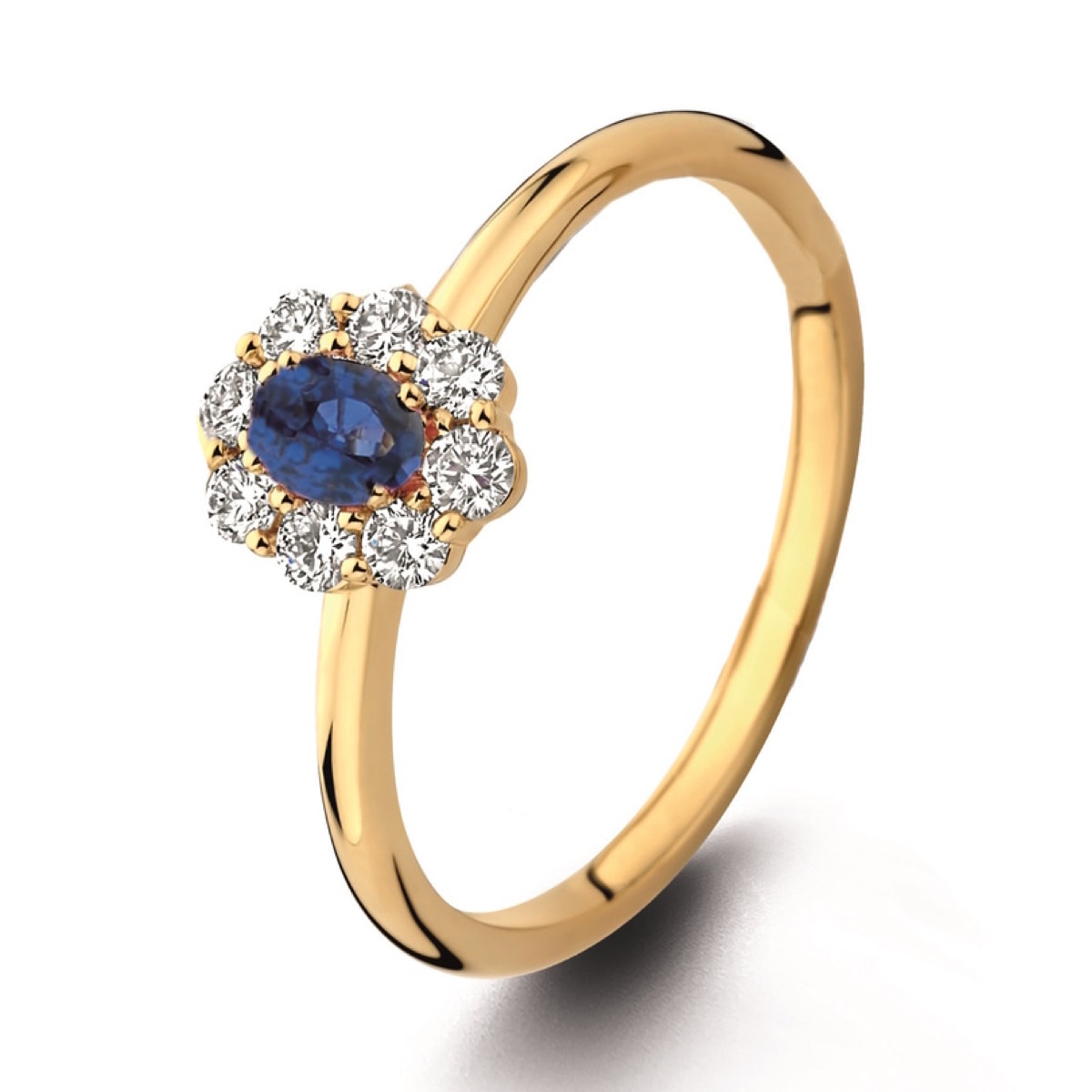 Bague marguerite en or jaune avec son saphir bleu ovale entouré de 8 diamants taille brillant.