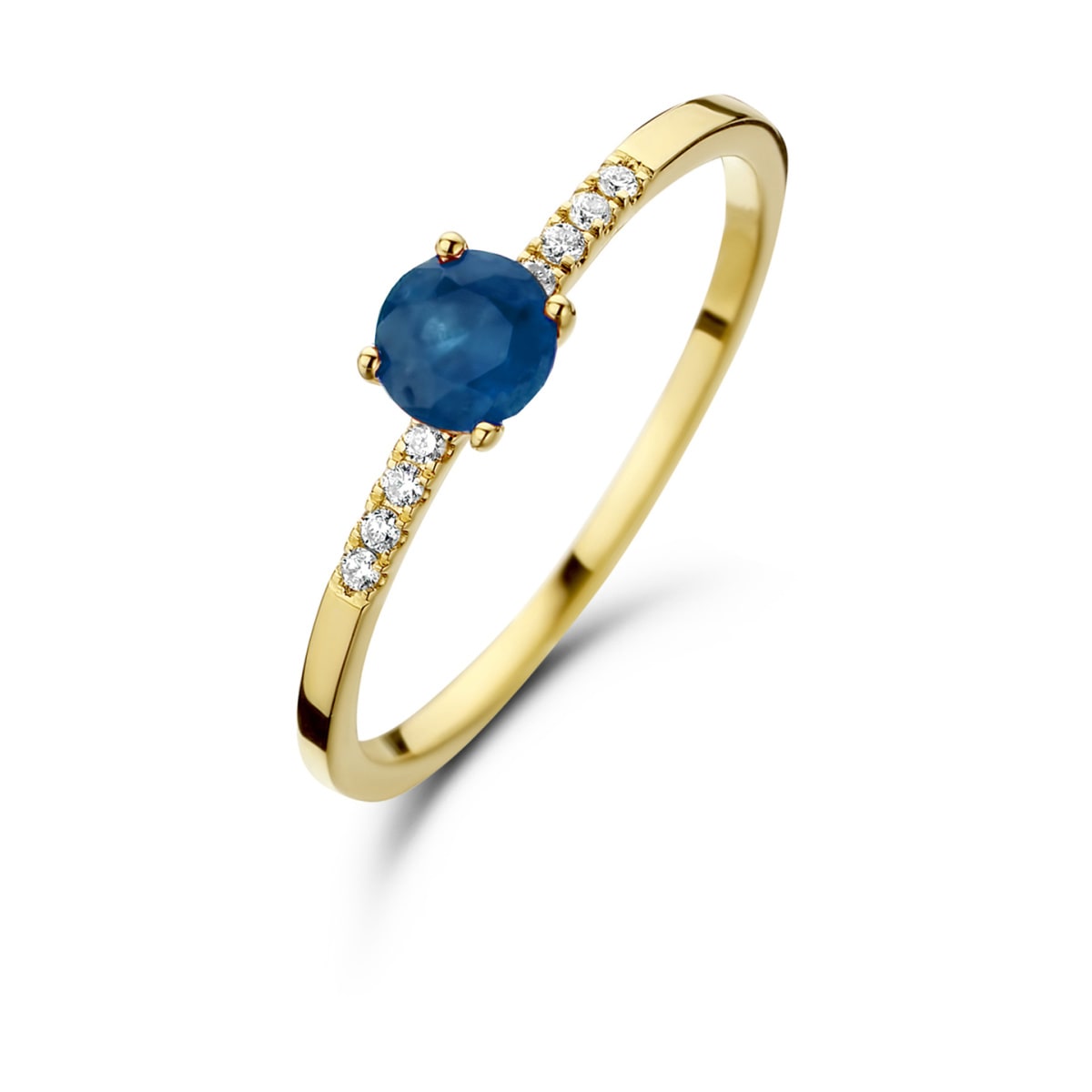 Délicate bague avec son saphir bleu de forme ronde qui est serti 4 griffes. De chaque côté, on retrouve 4 diamants taille brillant serti grain.