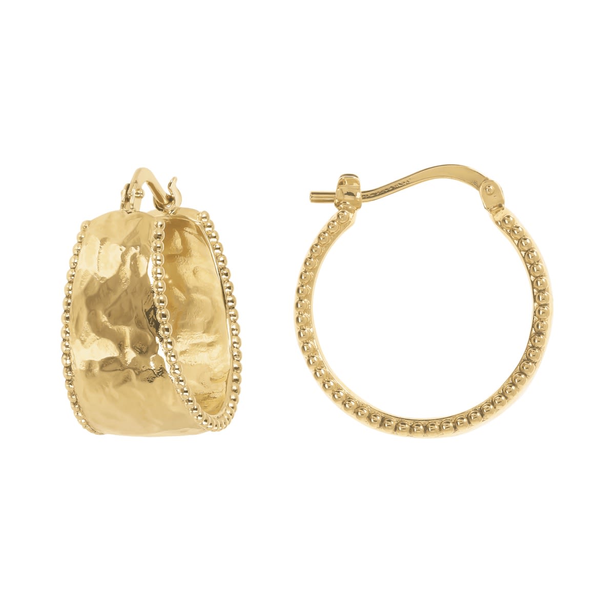 Boucles d’oreilles créoles audacieuses avec surface martelée et bords décorés en plaqué or 18 carats, pour un look fort et féminin.