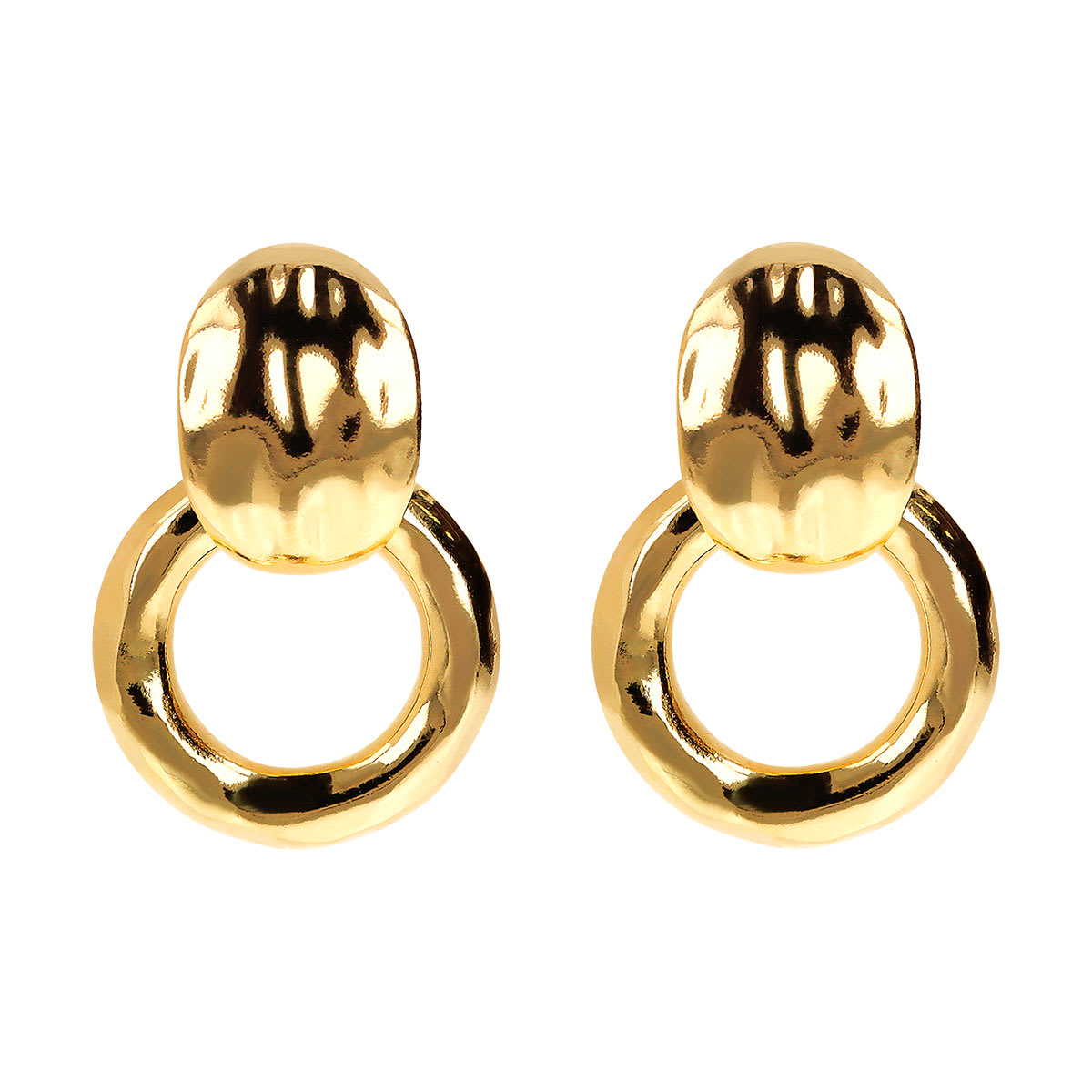 Boucles d'oreilles pendantes Etrusca Gioielli en alliage Golden, doré à l'or jaune fin 18ct, avec contre- maillon pépite plate et anneau (18 mm). Surface martelée. Longueur 2,5 cm. Fermeture épingle et papillon.