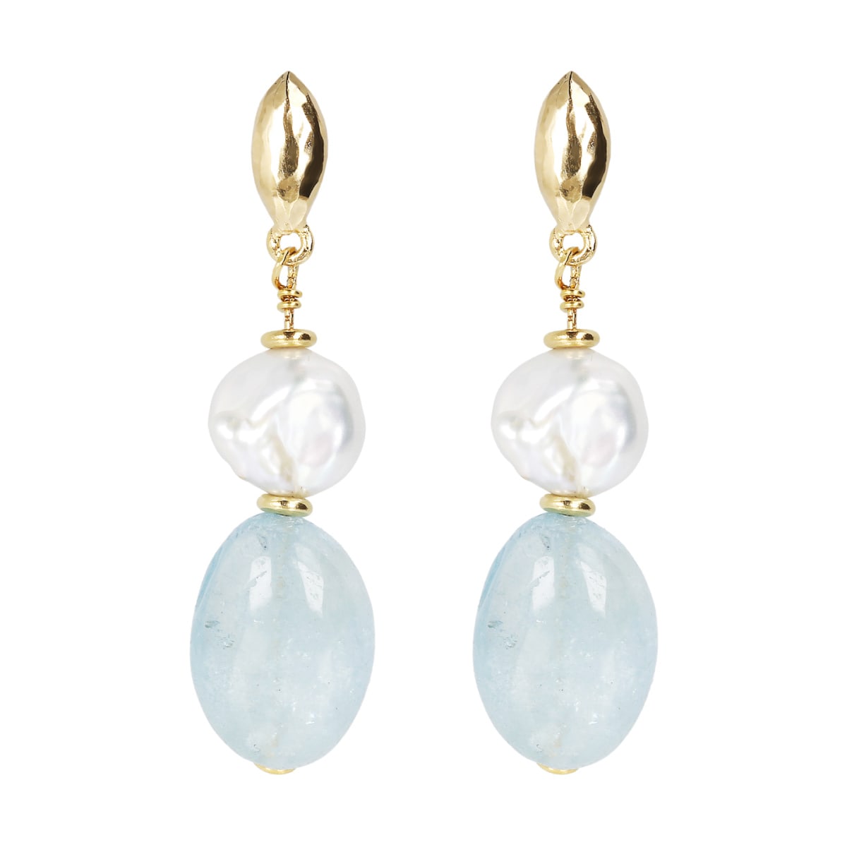 Boucles d’oreilles pendantes Etrusca Gioielli avec ses motif navette, perle blanche et quartz aqua.