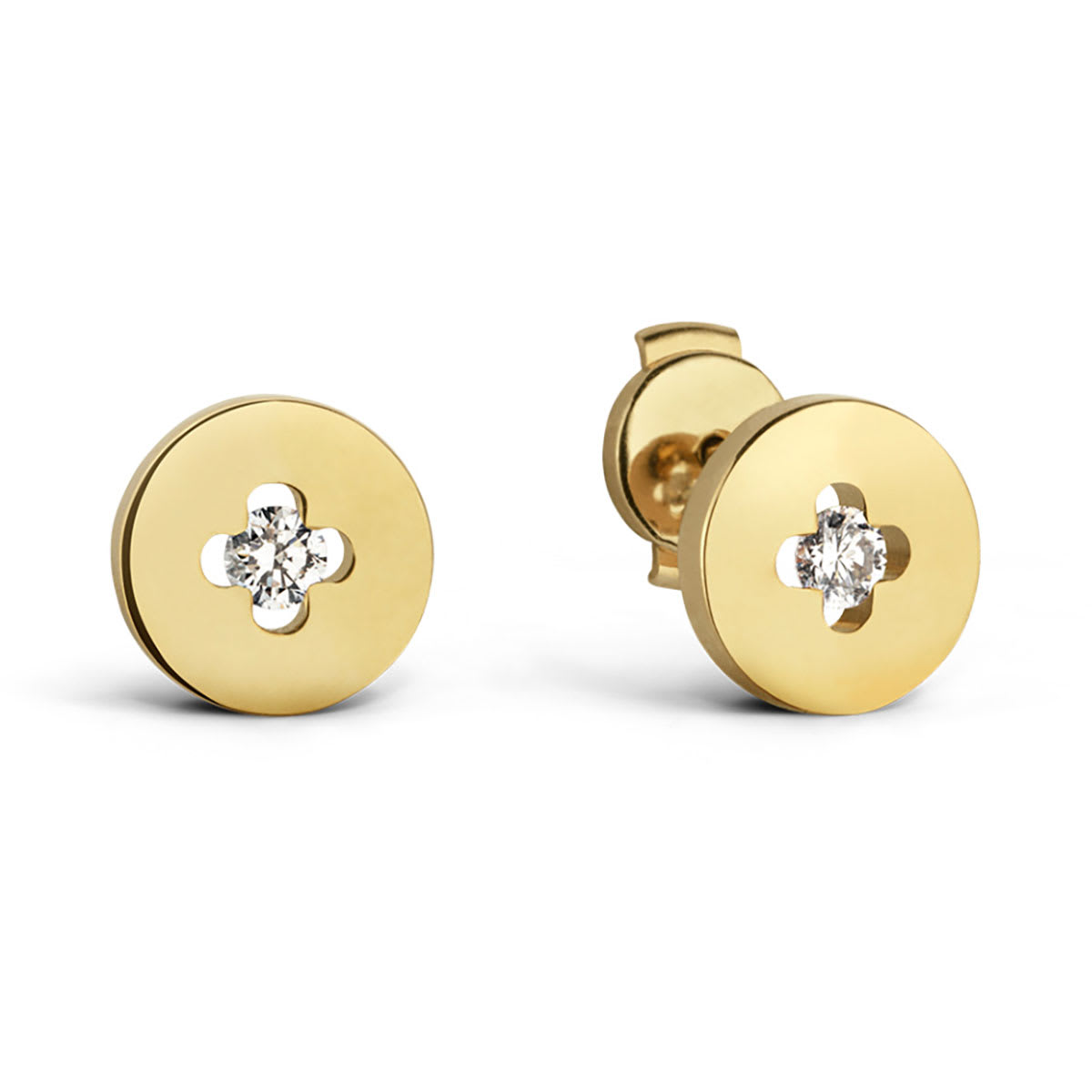 Les boucles d’oreilles en or jaune de la collection Royale font écho au quartier parisien, berceau historique du luxe et de la joaillerie. Un jeton d’or accueille une fleur ajourée à 4 pétales au sein de laquelle est enchâssé un brillant de 0,09 carat. Son serti aérien le fait rayonner de sa lumière, souli