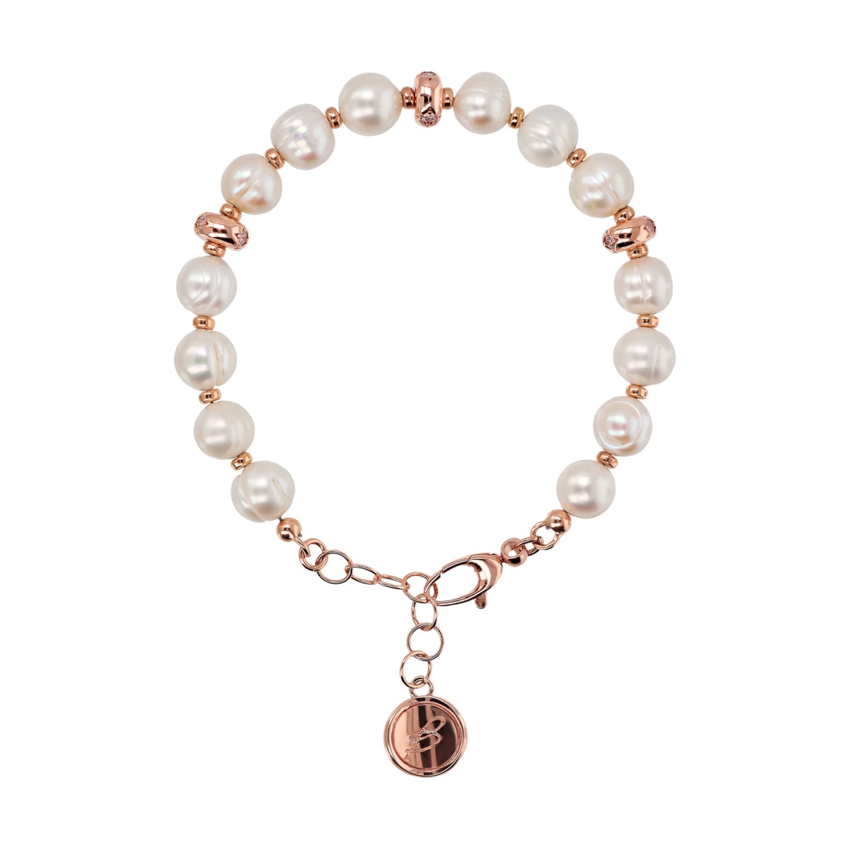 Bracelet en alliage Golden Rosé, plaqué or rose 18 carats, agrémenté de perles de culture d'eau douce cerclées de blanc d'un diamètre d'environ 8,5/9,5 mm, alternées de petites et grandes rondelles en Golden Rosé avec étoile gravée et point lumineux central en zircon cubique, lumineux qualité. Fermoir mousqueton.