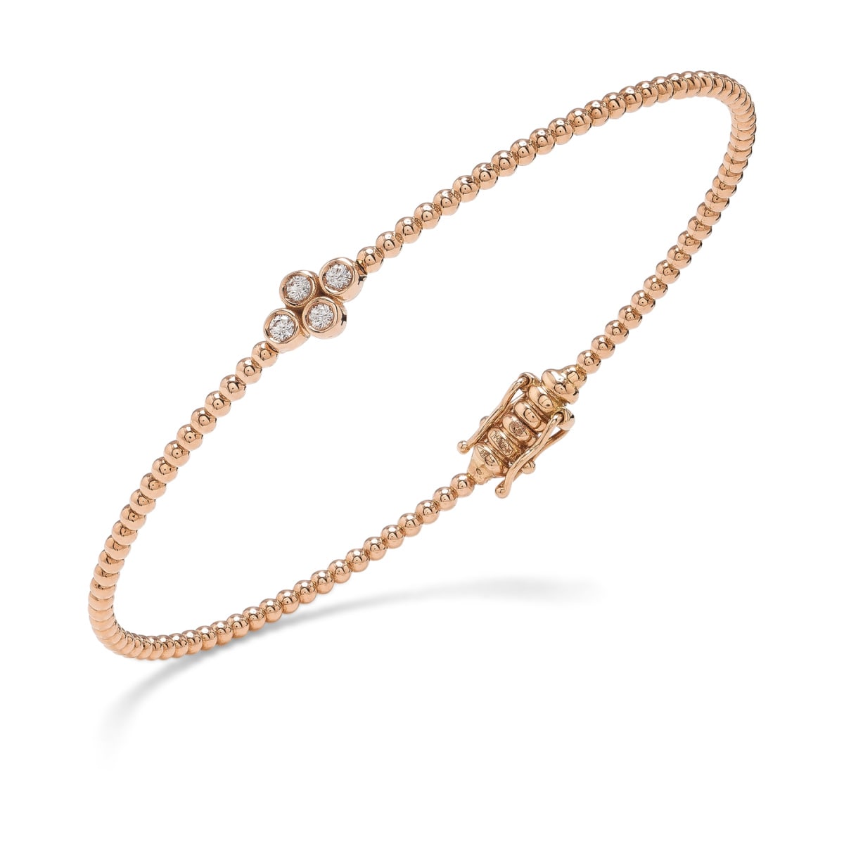 Un délicat bracelet rigide perlé en or rose et son délicieux motif composé de 4 diamants blancs sertis clos.