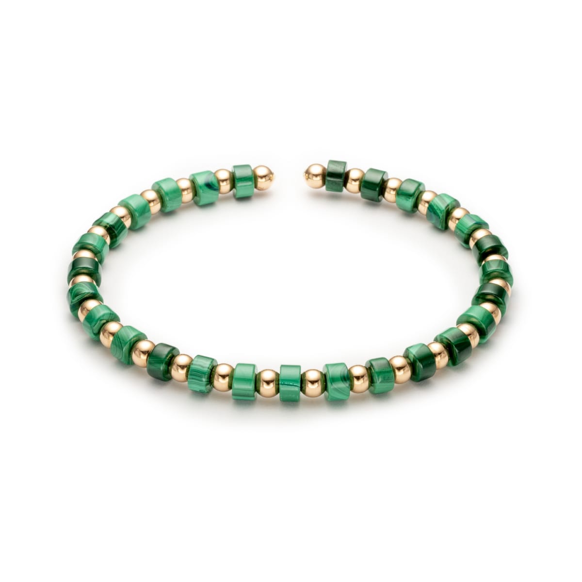 Bracelet rigide en fil de titane ouvert avec 26 perles en malachite et 27 perles en or rose