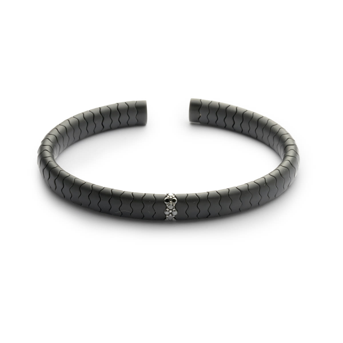 Bracelet rigide ouvert en acier et céramique noire mâte. en central, on découvre un motif en diamants noirs