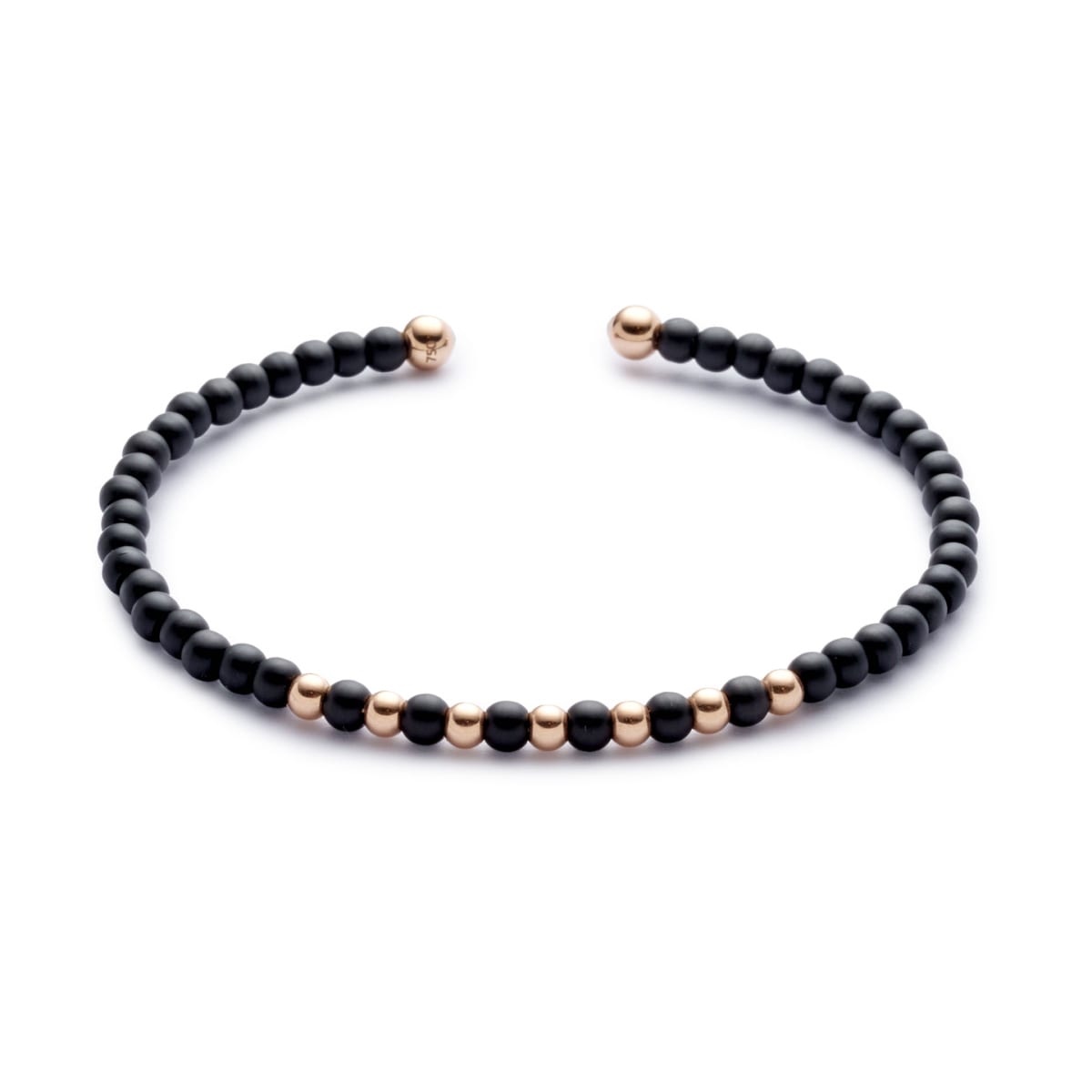 Bracelet rigide en fil titane ouvert et ses perles rondes en céramique noire et ses 9 perles en or rose alternées en motif sur le dessus