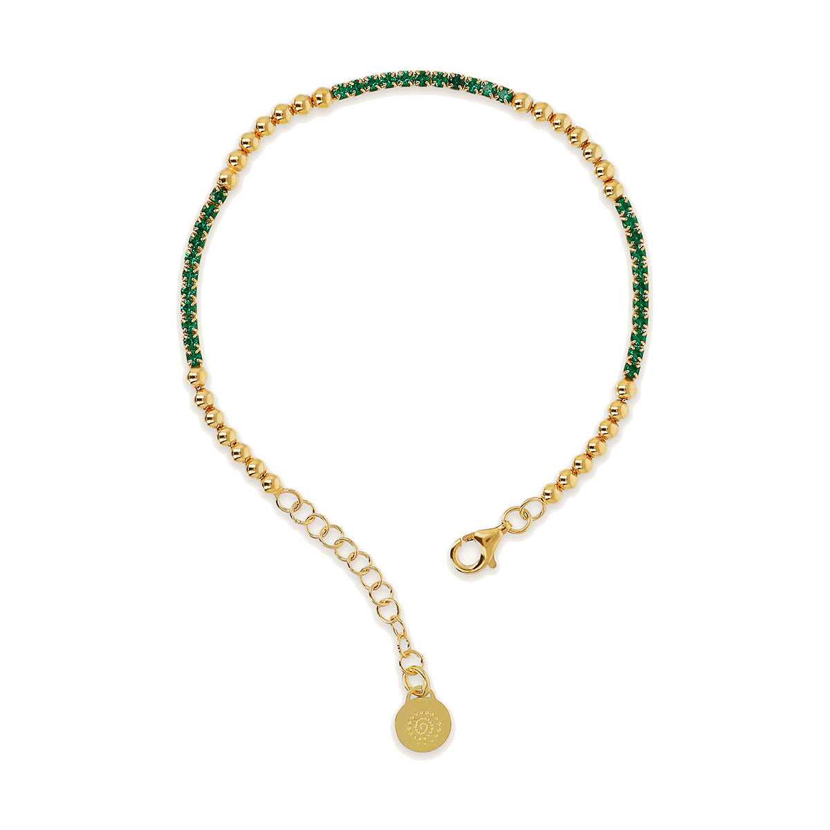 Bracelet tennis mixte Etrusca Gioielli en argent 925, doré à l'or fin 18ct, agrémenté de petites perles dorées alternant avec des zirconiums verts, qualité lumineuse; fermoir mousqueton avec rallonge.