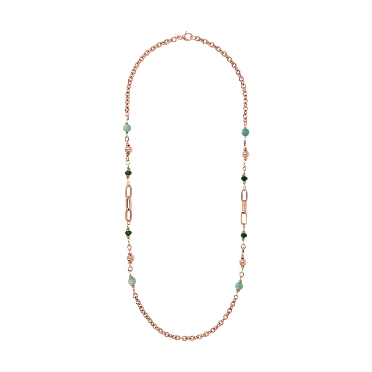 Sautoir Bronzallure réalisé sur une base Golden Rosé, plaqué or rose 18kt, avec chaîne rolo alternant avec des maillons rectangulaires agrémentés de quatre sphères (10 mm) et quatre rondelles (8 mm) en pierre de quartzite naturelle; Fermoir à homard.