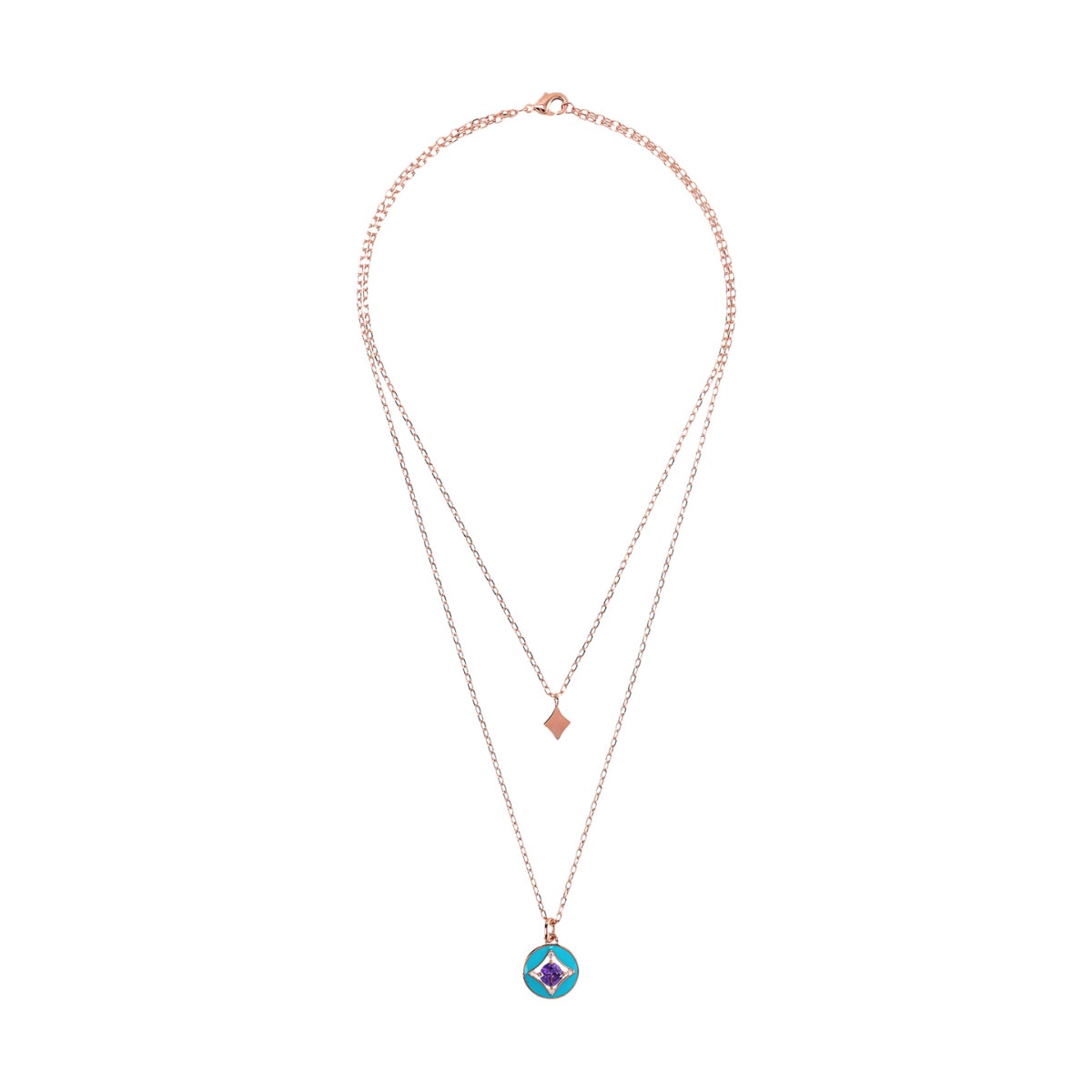 Collier double rangs maille forçat avec son pendentif losange et son pendentif laque turquoise, oxyde violet et ses 4 strass