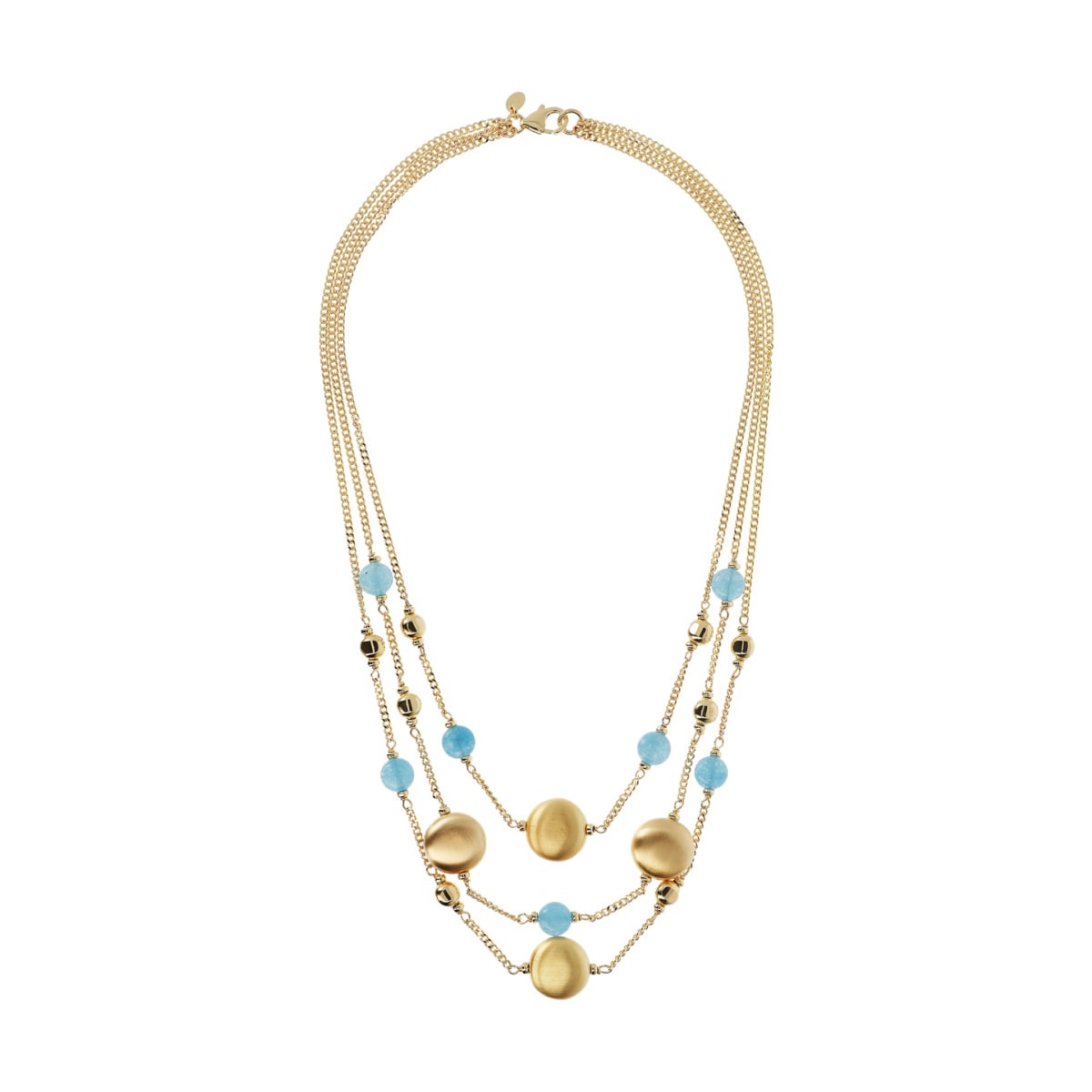 Collier multirangs Etrusca Gioielli monté sur une base dorée, plaqué or jaune 18 carats, composé de trois rangs gradués : le plus long et le plus court ont une chaîne gourmette agrémentée de stations de sphères dorées, de petites pierres naturelles (quartz céleste ou rose) et ont un rond avec une surface satinée placée au centre; le collier moyen comporte des sphères dorées, de petites pierres naturelles (quartz céleste ou rose) et deux éléments ronds avec une surface satinée placés sur les côtés ; Fermoir à homard.
