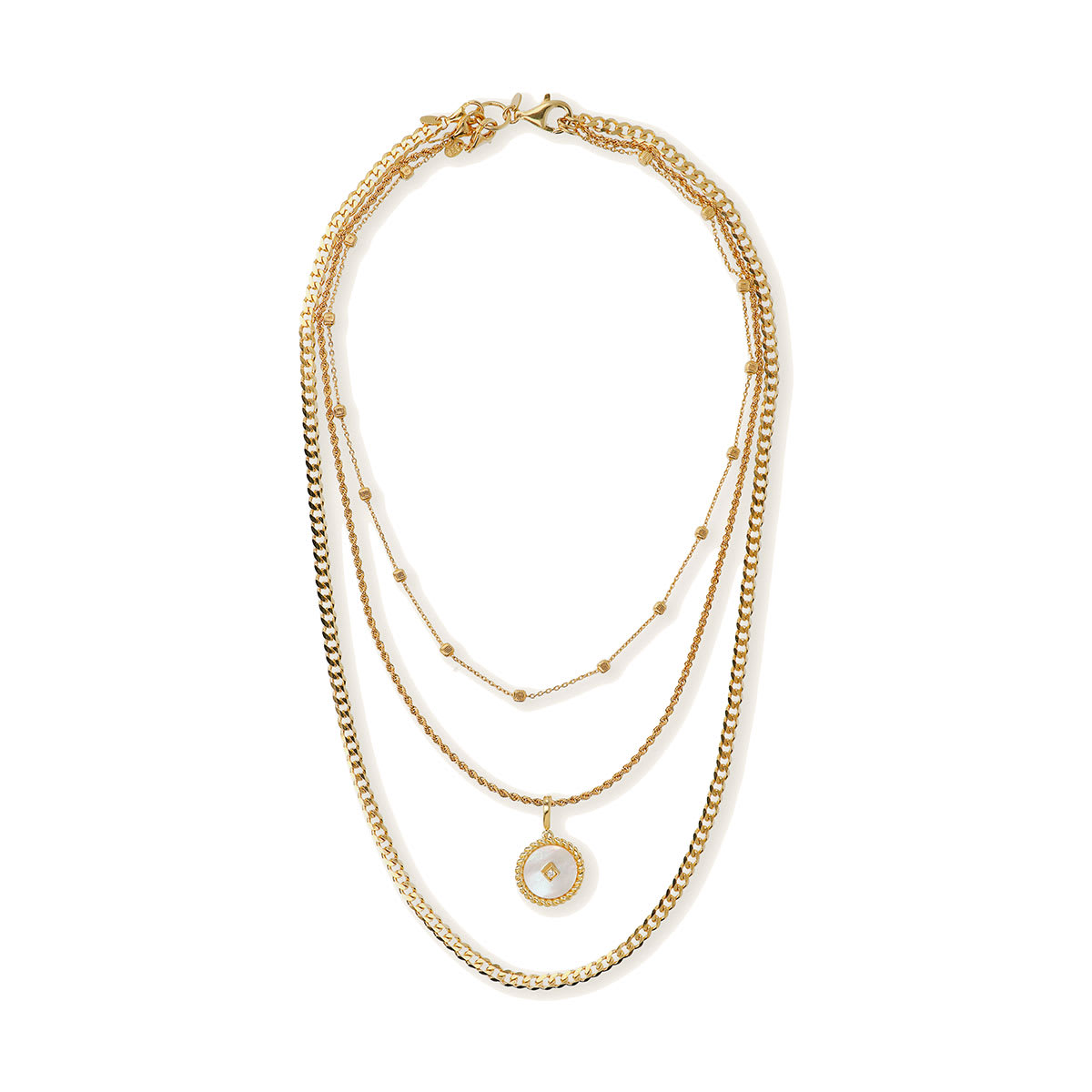 Collier multirang Etrusca Gioielli en argent 925, doré à l'or fin 18ct, composé d'une chaîne chapelet (40,6 cm) avec des éléments cubiques taillés en diamants; une chaîne corde (45,7 cm) avec un pendentif rond en nacre blanche, bords en relief et un point lumineux en oxyde de zirconium ; une gourmette classique (55,8 cm) ; Fermoir à homard.