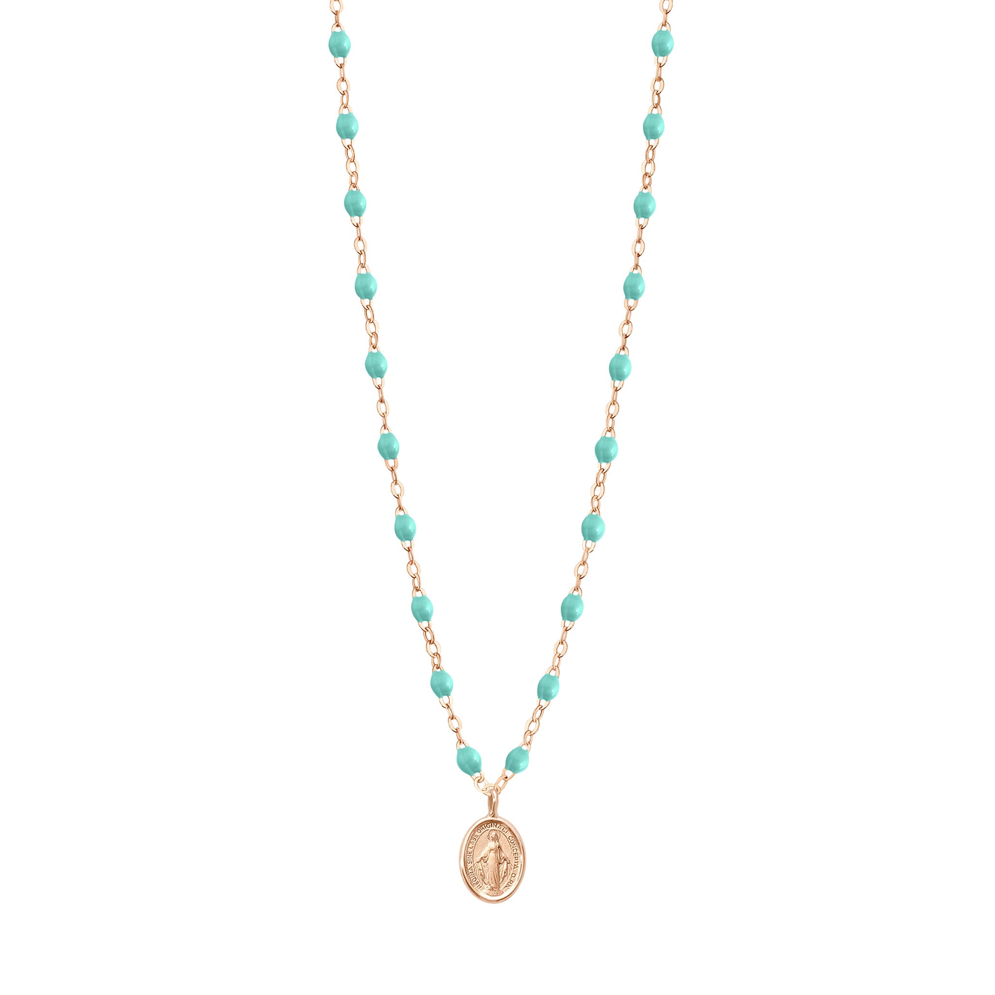 Collier or rose, résine vert d’eau, madone, 42 cm