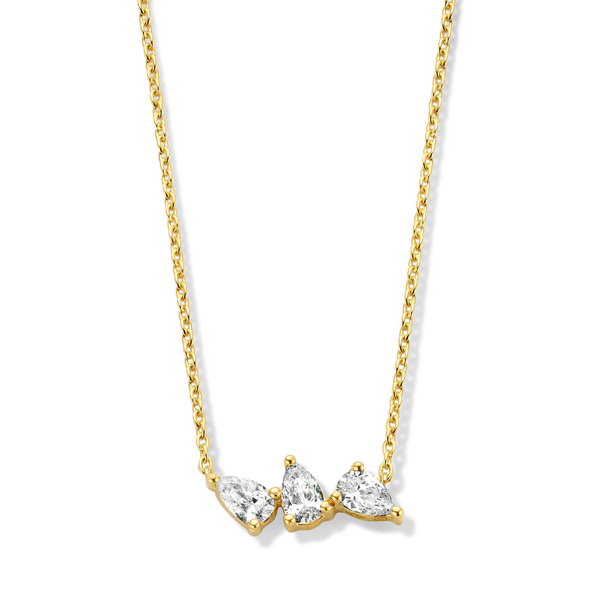 Délicat collier avec sa trilogie de diamants poire en serti griffes sr une chaine en maille forçat.