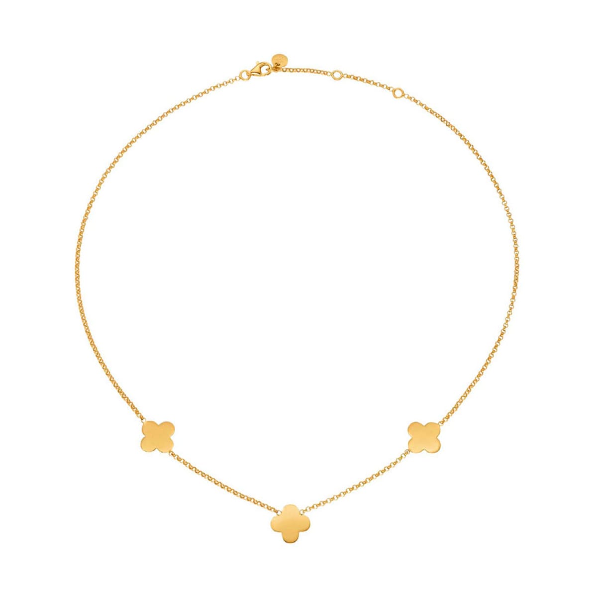 Porte-bonheur du quotidien, découvrez ce collier trèfle à quatre feuilles. Tout en or jaune 18 carats, ce collier arbore trois trèfles : le premier au centre et le deuxième et troisième de part et d'autre de ce dernier. La longueur de ce collier est de 42 centimètres, ajustable à 40 et 38 centimètres.
