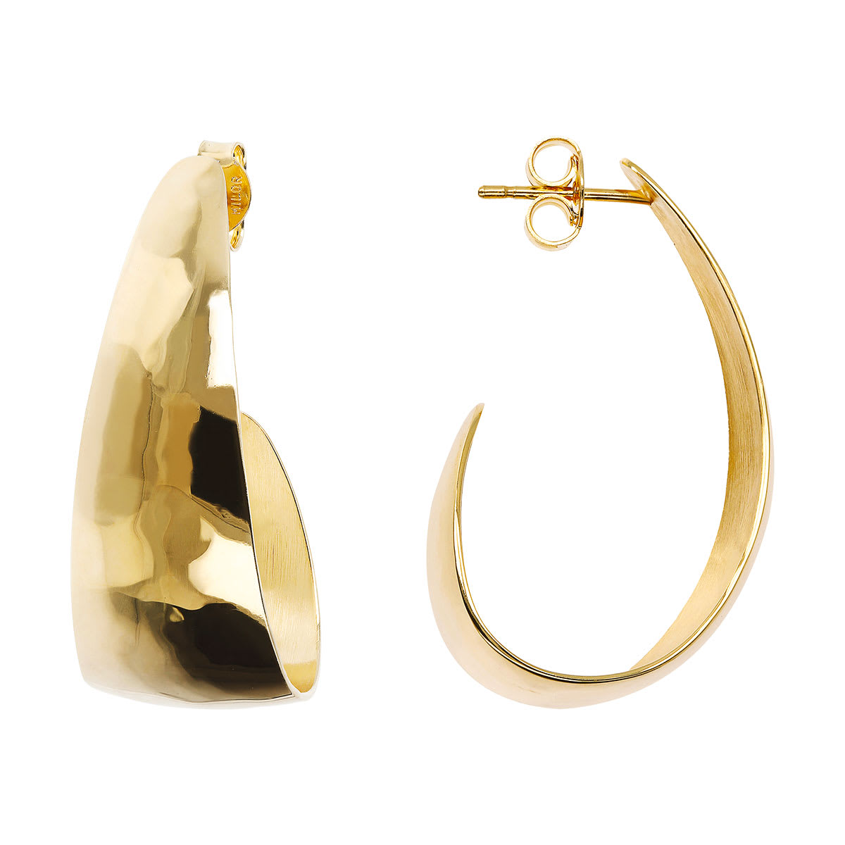 Boucles d'oreilles pendantes créoles Etrusca Gioielli en alliage Golden, doré à l'or fin 18ct, agrémentées d'un motif de boucles avec une surface martelée; fermoir clou et papillon; longueur de 3 cm.
