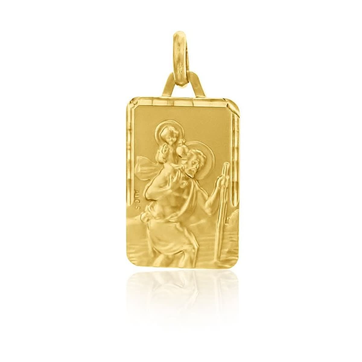 Cette médaille rectangulaire à la finition satinée diamantée est en Or Jaune 18 carats. Elle représente Saint Christophe portant l'Enfant Jésus sur ses épaules et traversant un fleuve. Le bord de la médaille est facetté. La hauteur de celle-ci est de 18 millimètres et la largeur est de 11 millimètres. La bélière est de forme ovale.