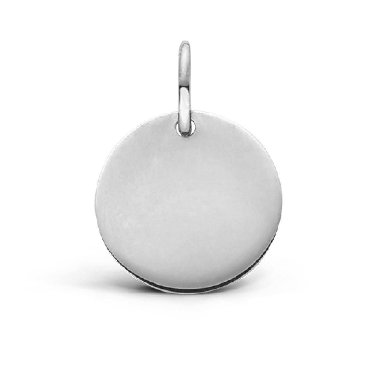 Ce pendentif rond est en argent à la finition polie brillante. Il mesure 10 millimètres de diamètre