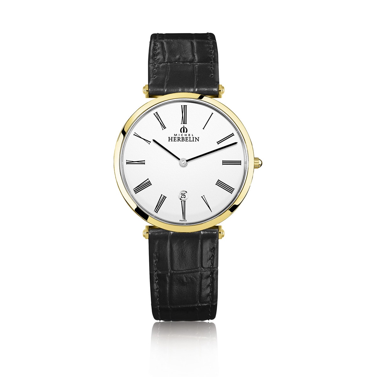 Munie d’un boîtier en PVD or jaune, cette montre est habillée d’un cadran velouté marqué de larges chiffres romains. Montée sur un bracelet en cuir noir, qui lui confère élégance et distinction. Son design extra plat épouse à merveille les poignets masculin