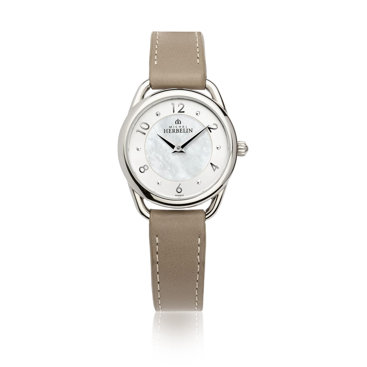 Dotée d’un cadran en nacre véritable décoré de chiffres arabes et habillée d’un bracelet en cuir double tour, cette montre Michel Herbelin accompagne les poignets féminins avec distinction.
