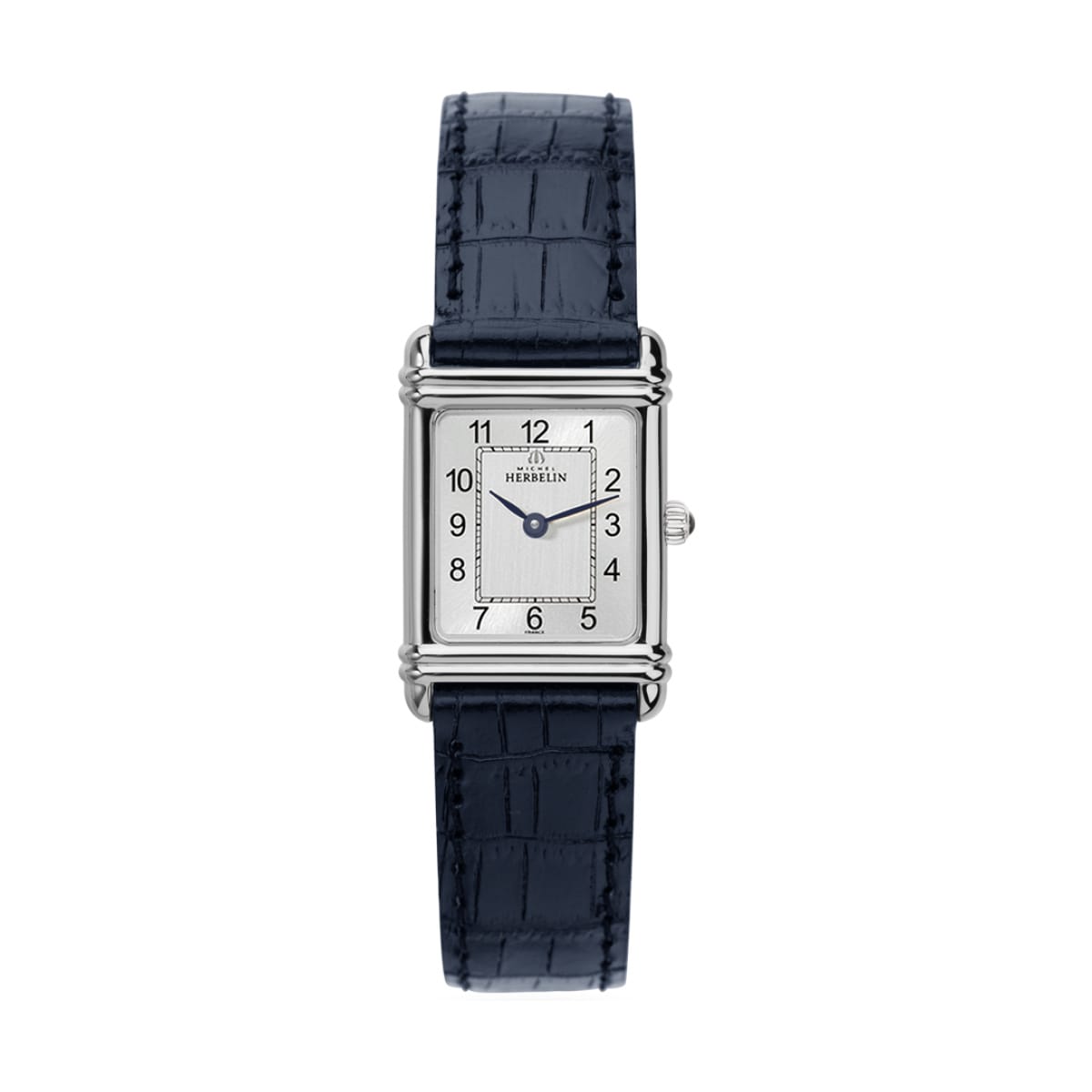 Une montre intemporelle avec son boîtier rectangulaire très Art Déco. Le fond dispose d'un effet soleillé qui s'accorde avec le bracelet bleu crocodile de couleur bleue. On apprécie le chemin de fer des minutes délicatement appliqué dans un liseré de forme carré.