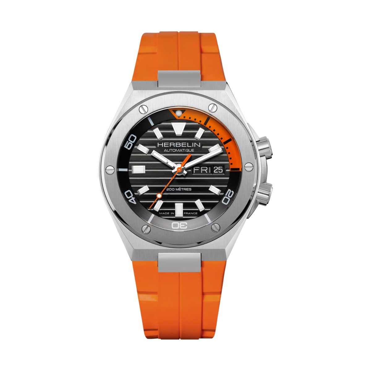 Techniquement avancée, cette montre dispose de nombreux atouts pour les plongeurs. Le rehaut de plongée interne tournant bidirectionnel, réglable par une couronne vissée, est marqué d’un indicateur luminescent pour faciliter le calcul du temps de plongée. Les “15 premières minutes” sont accentuées par une couleur orange vibrant pour une lisibilité optimale. Les couronnes vissées garantissent une étanchéité jusqu’à 200 mètres, et empêchent tout dysfonctionnement dû à un coup de palme. Les aiguilles et index, revêtus de matière luminescente, assurent une visibilité parfaite même dans l’obscurité des fonds marins. La trotteuse, également orange vibrant et en perpétuel mouvement, indique de manière continue le bon fonctionnement de la montre.