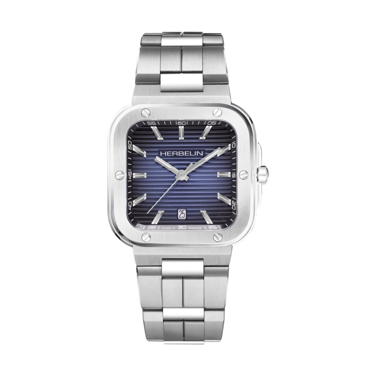 En acier inoxydable, le boitier est carré aux angles arrondis. Original et moderne, cette montre habillera avec élégance les poignets masculins. Le boitier fait corps avec son bracelet intégré et donne à cette montre un esprit moderne et sportif. Le fond bleu dégradé et frappé à l’horizontal apporte une touche d’élégance à Cap Camarat. Herbelin signe toute ses modèles à Charquemont.