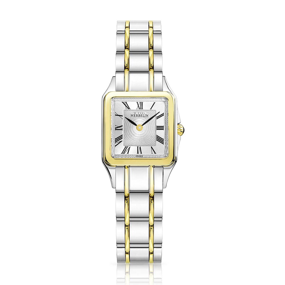 Très chic avec sa forme carrée, le cadran bicolore est finement travaillé en double cercle et son fond guilloché qui apporte un joli relief à cette montre.