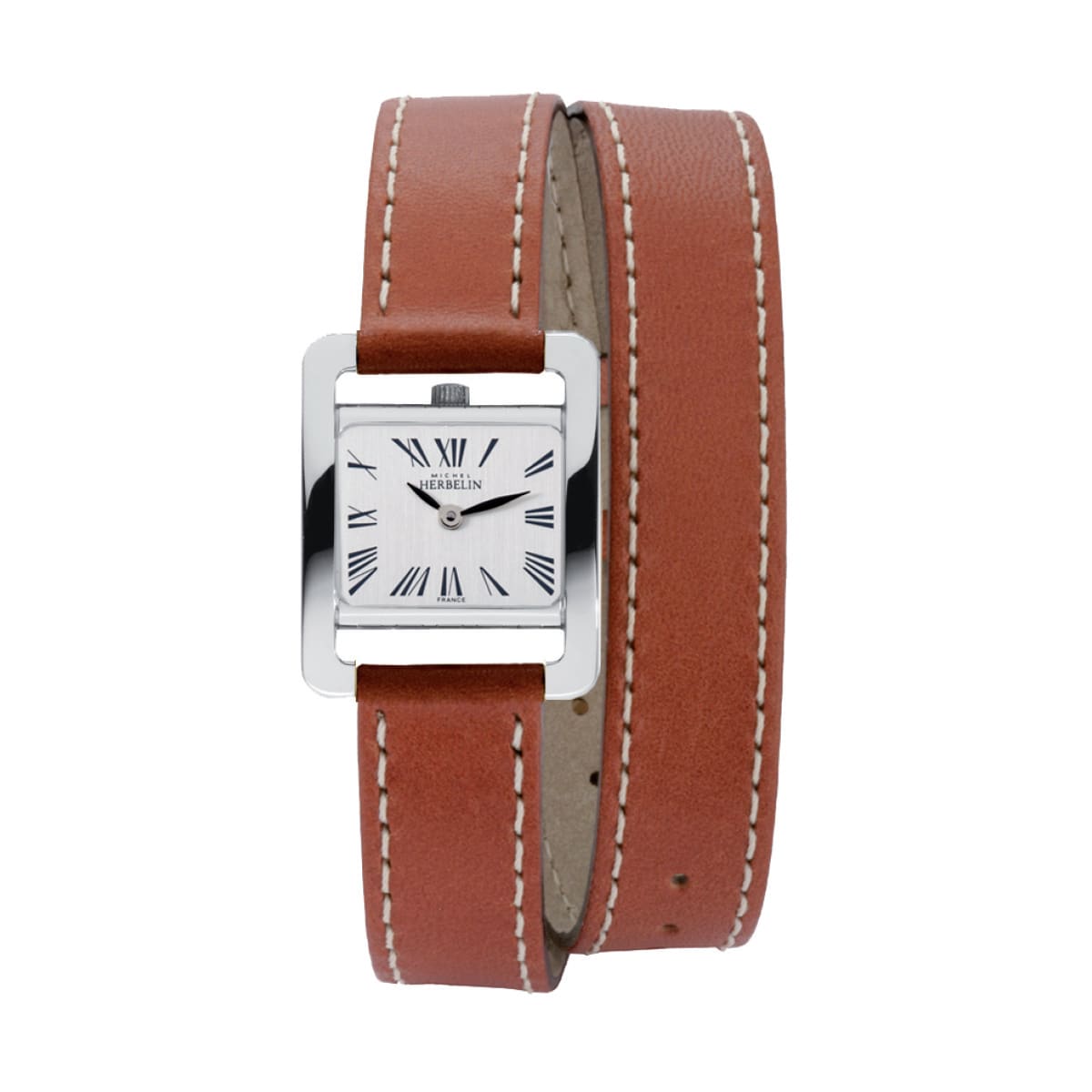 On apprécie la sobriété du cadran blanc avec ses deux aiguilles noires et ses index de type chiffres romains. Le bracelet est en double tour en cuir véritable de couleur marron avec une très élégante surpiqure blanche. Le verre utilisé est un verre minéral.