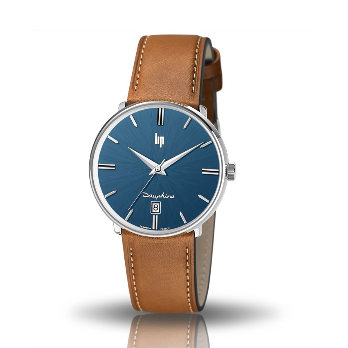 Montre LIP acier, cadran bleu soleillé, index et aiguilles argentés, dateur à 6h, bracelet cuir marron. Etanche 5ATM. Garantie mouvement 2 ans