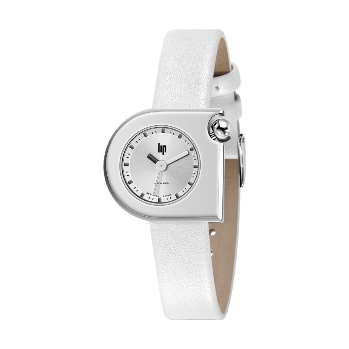 Prix de vente conseilléMontre Lip Mach 2000 Mini Moon est en forme de demi-lune, cadran et boitier argenté, bracelet cuir blanc paillette.