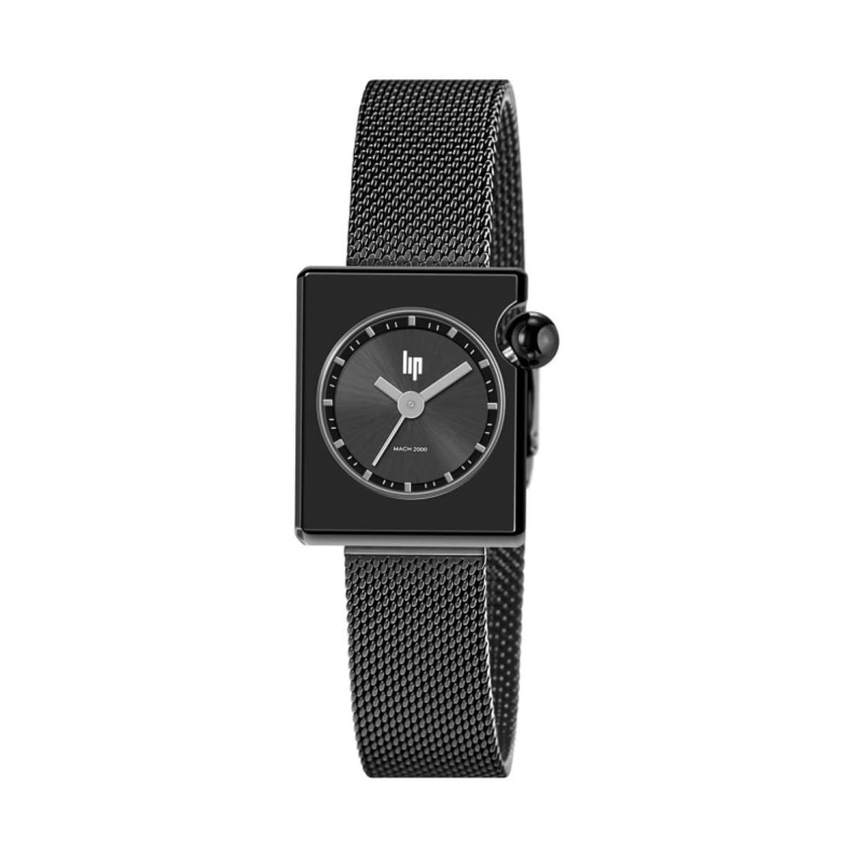 Prix de vente conseilléMontre Lip Mach 2000 Mini Square est de forme carré, cadran et boitier noir, aiguilles et index argentés.