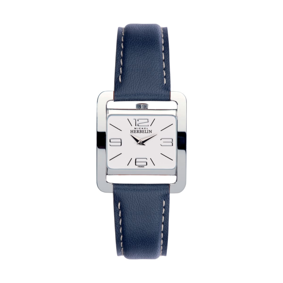 Le cadran carré dispose d'un fond de couleur blanc avec 2 aiguilles et des index doubles de couleur argentée (chiffres romains et bâtons).