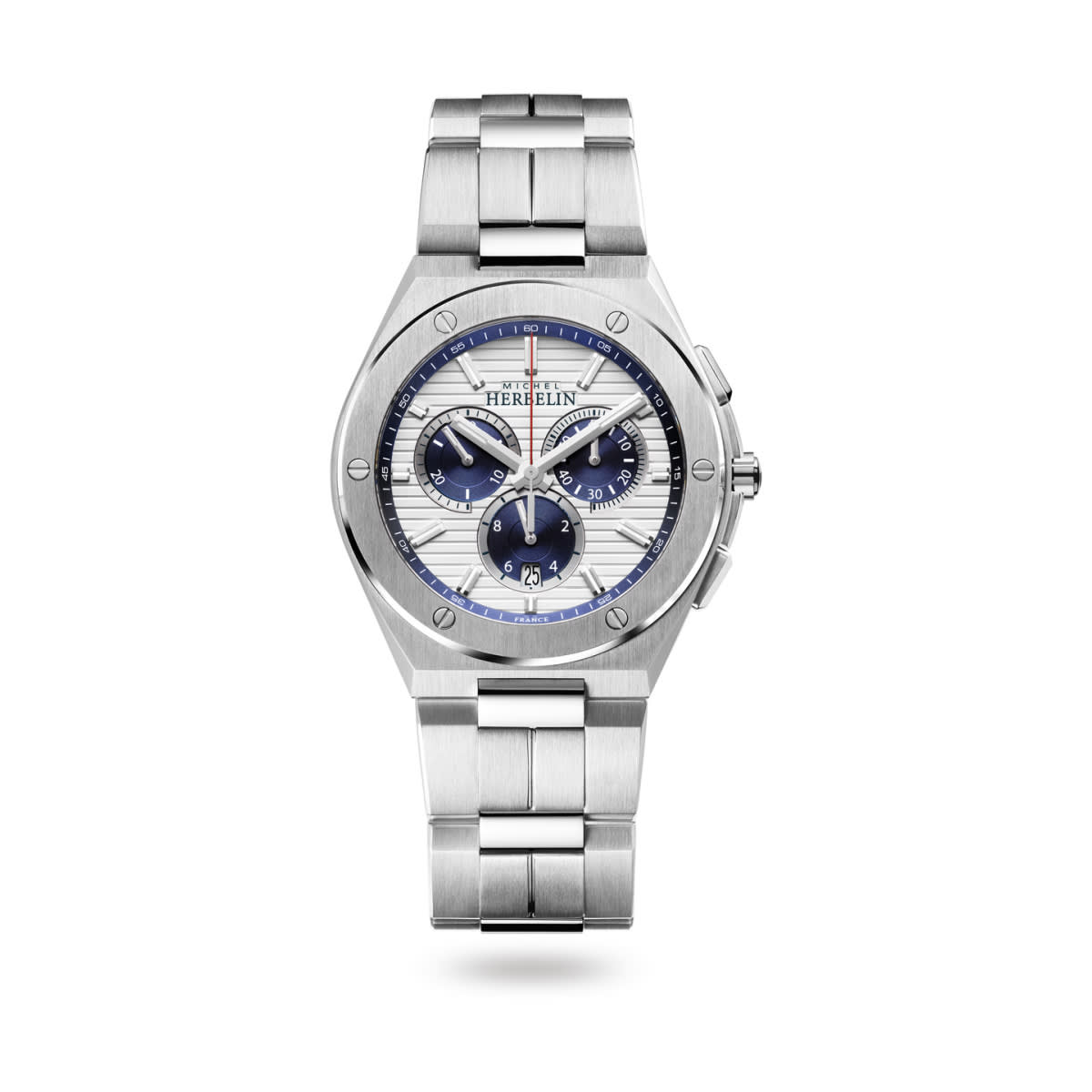 Paré d’un rehaut bleu sur un cadran blanc animé par une petite seconde rouge, ce garde-temps Made in France affiche sobrement ses origines tout en conservant son esprit 70’s. Marquée de trois compteurs ce chronographe offre une allure chic et sportive, il traduit l’élégance à la française sans ostentation.