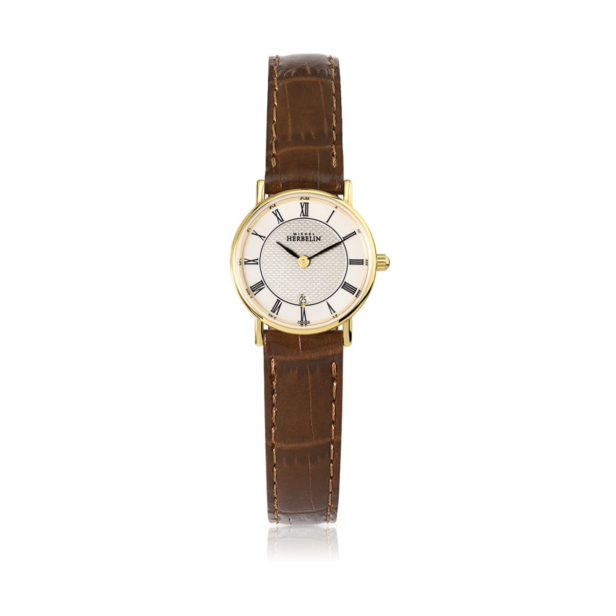 Cette montre Michel HERBELIN, munie d’un boitier en PVD or jaune et d’un bracelet en cuir véritable marron, se marie à tous les styles avec distinction. Son cadran marqué de chiffres romains la rend indémodable. A la fois sobre et élégante, elle sublime les poignets féminins.