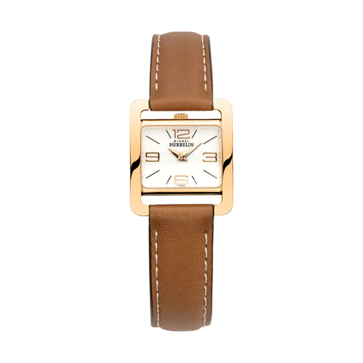 Montre rectangulaire en acier inoxydable doré rose, verre saphir, bracelet cuir gold. Avec son fond blanc et ses index doré rose, cette montre est à la fois moderne et chaleureuse. Etanche à 3 ATM. Garantie mouvement 2 ans.