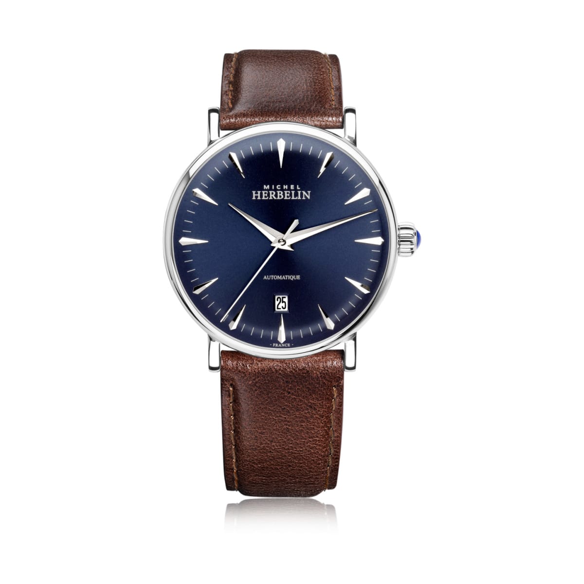 Cette montre Michel HERBELIN est équipée d’un mouvement mécanique à remontage automatique, qui laisse admirer ses rouages par le fond transparent du boîtier. Elle est dotée d’un boîtier à la carrure toute en rondeur, de 40 mm de diamètre, qui lui donne une allure vintage. Celui-ci dévoile un cadran bleu profond, offrant de multiples nuances sous l’effet de la lumière par son décor brossé-soleillé. Complété à 6 heures d’un guichet de date discret, l’ensemble cadence le passage du temps avec sobriété. Finalisée d’une couronne boule cannelée sertie d’un cabochon bleu et habillée d’un bracelet en cuir patiné brillant marron, cette pièce est un véritable bijou horloger dessinée et assemblée en France dans les ateliers de la marque Michel HERBELIN